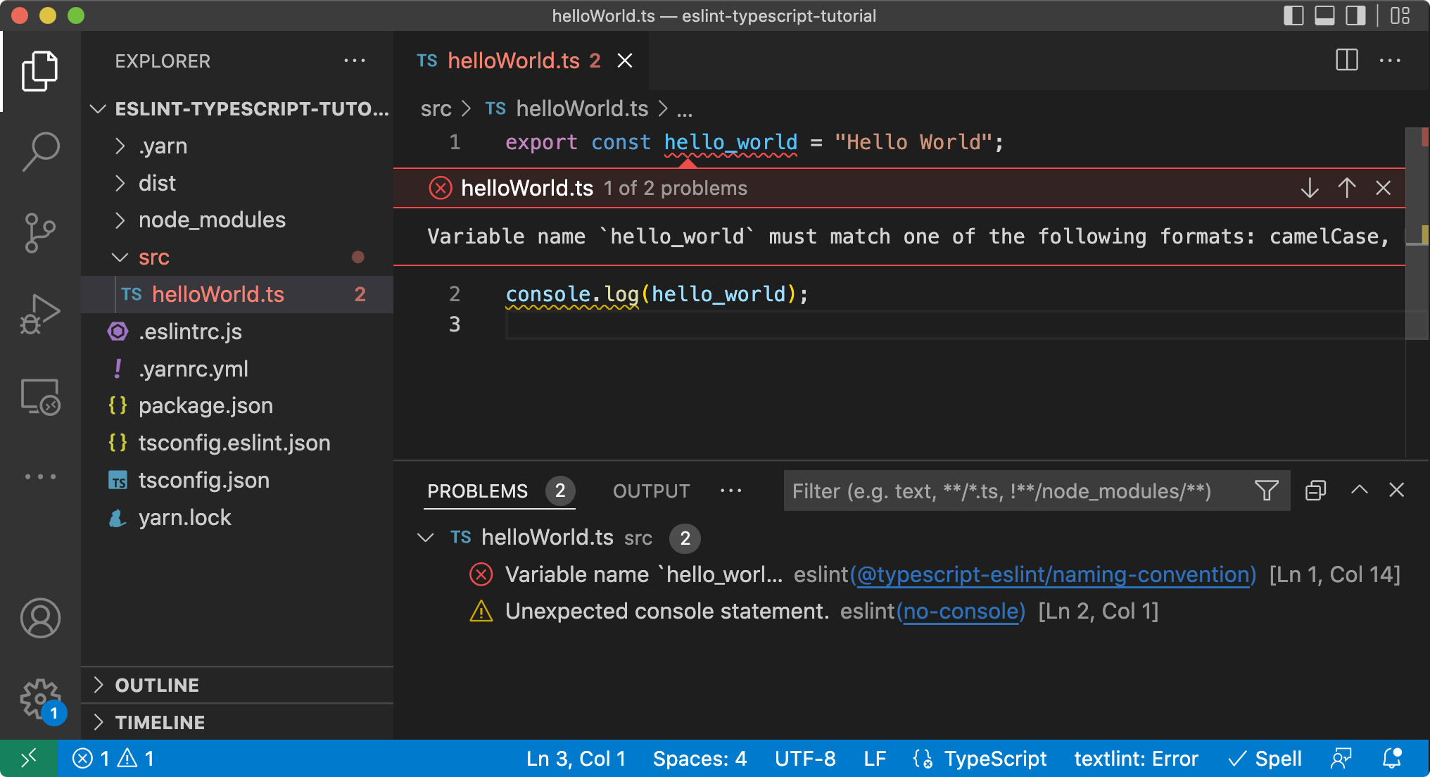 Hãy sửa những vấn đề này. Thay đổi src/helloWorld.ts thành nội dung sau và save.
