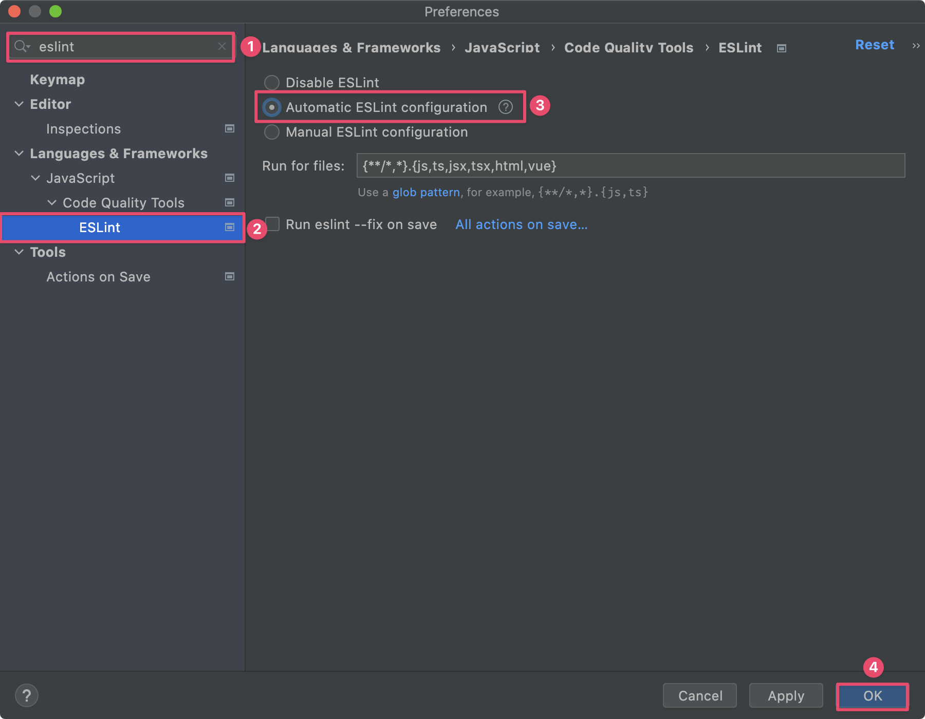 WebStorm có sẵn tính năng tích hợp ESLint, nên không cần install plugin, v.v. Để enable ESLint, mở "Preferences", nhập "eslint" vào ô tìm kiếm (①). Mở "ESLint" từ menu được lọc (②). Check vào "Automatic ESLint configuration" (③). Cuối cùng nhấn "OK" để hoàn tất setting (④).